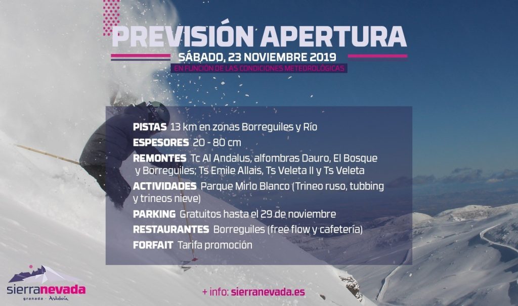 La estación de esquí y montaña de Sierra Nevada inaugurará este sábado, 23 de noviembre, la temporada invernal 2019/20 con 13 kilómetros esquiables, 900 metros de desnivel y espesores de nieve (calidad polvo) de entre 20 y 80 centímetros.